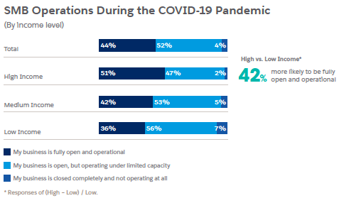 Our SME Trends Report shows that 59% of SME leaders say that compliance with public health requirements creates an excessive burden on their operability, and 65% say that the viability of their business is being threatened by local mandates to limit operations or close. With those numbers in mind, it should come as no surprise that 57% of SME leaders say that they’re struggling to keep their business afloat.