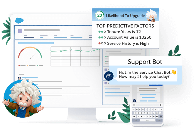 We like to think of Einstein as an AI helper. It’s like a data scientist that puts the power of AI to work for companies large and small. Einstein lives and works inside your existing CRM. So there are no complex integrations or onboarding processes required for it to work for you.