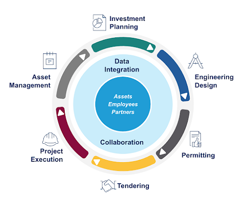 The second component is made up of flexible, tailored digital solutions that contribute to each individual phase of the capex cycle. Each one makes its stage of the process easier and more efficient, allowing vertical deep dive analysis on planning, permitting, procurement, execution, operations and maintenance.