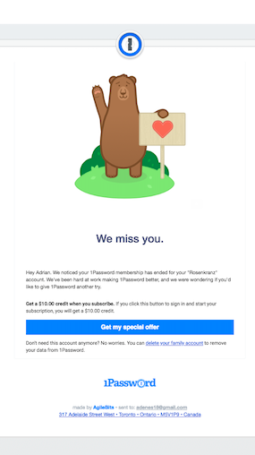 הנה דוגמה מצוינת לדוא"ל מותאם אישית מ-1password. הם ידעו שהמשתמש לא התחבר זמן מה על סמך נתוני השימוש באפליקציה. ולכן, כדי לפתות אותו להתחבר מחדש הם שלחו לו הצעה מיוחדת.