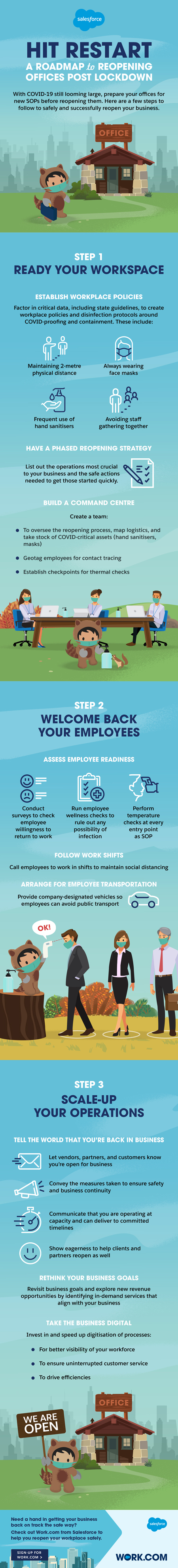Need a hand in getting your business back on track the safe way? Salesforce offers work.com for businesses of all sizes, to help you reopen your workplace safely. Work.com helps you assess employee readiness, deploy contact tracing, create shift-based employee arrangements, and get a bird’s eye view of critical organisational data to reopen workspaces successfully and safely. All you need to do is sign-up and get started - no installation or learning required.
