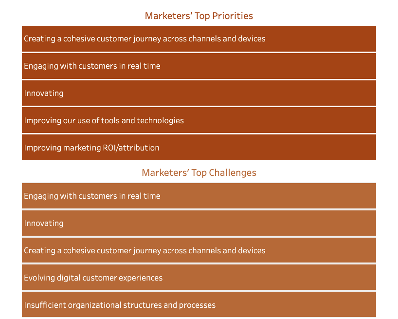 Some of marketers’ top priorities and challenges are evergreen — innovation and real-time customer engagement, for example. It’s what’s new to the list that paints a vivid picture of what marketers are excited about — and concerned by.
