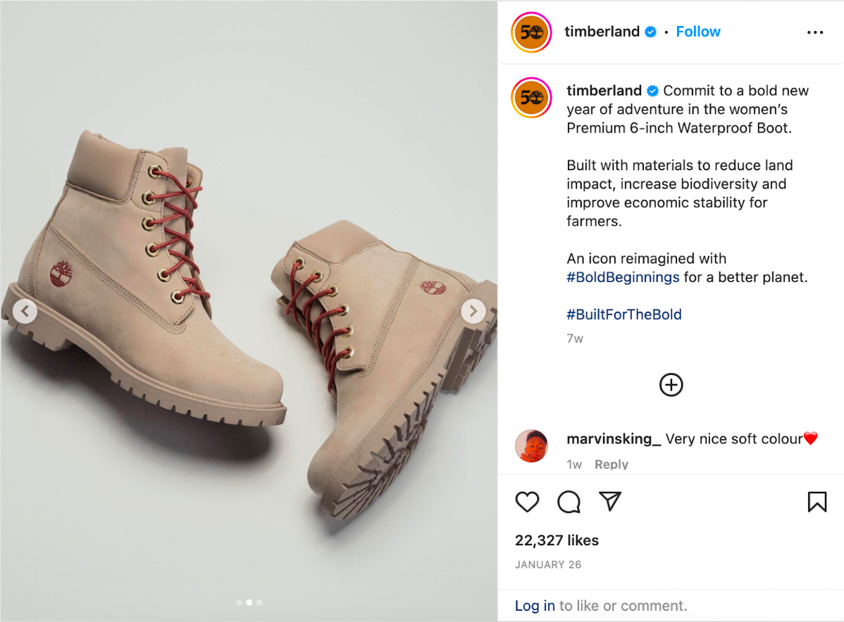 Take a look at how Timberland leads with its values by showcasing its sustainable materials in imagery and captions: