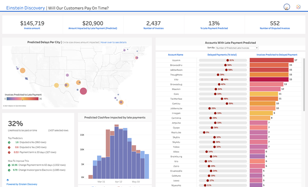 Las predicciones, la información y las explicaciones automatizadas impulsadas por la inteligencia artificial con Tableau Business Science permiten a los equipos de ventas analizar datos y tomar decisiones inteligentes, más rápido, sin depender de un científico de datos, por ejemplo, al actualizar cuotas, observar la precisión del pronóstico o reevaluar las estrategias de venta con clicks, sin necesidad de usar códigos.