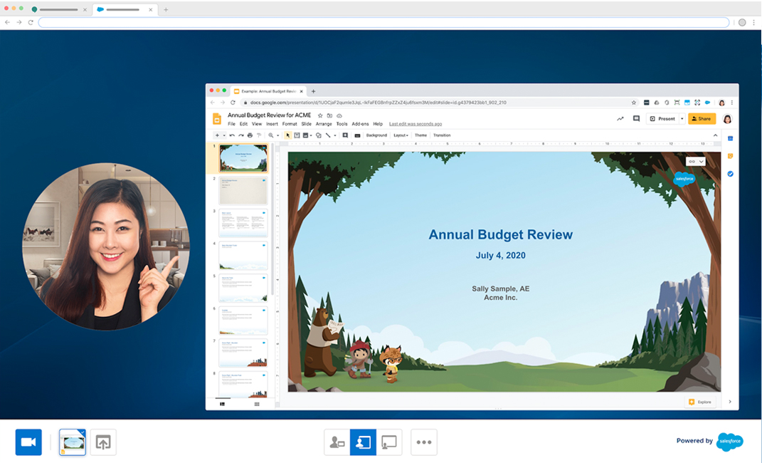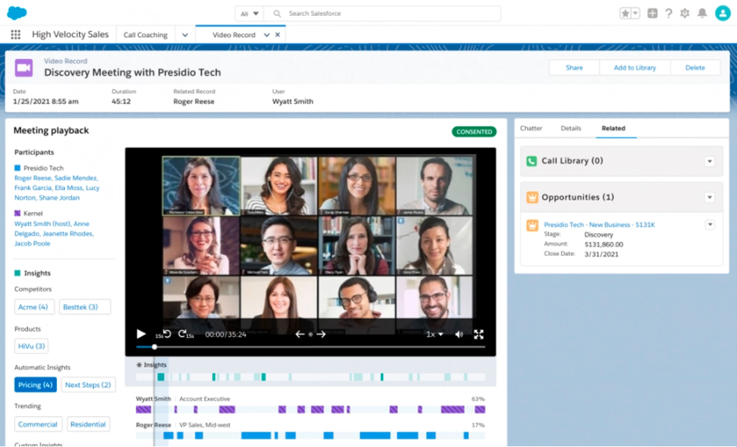 ahora está disponible de forma generalizada y hace que las conversaciones virtuales sean más atractivas. Antes de una reunión, los vendedores tienen una vista de 360 ° de todos los asistentes en una sola pantalla, incluido el historial de la cuenta, casos de servicio abiertos y biografías. Una vez que comienza la reunión, tanto la presentación como el presentador se muestran juntos para una conexión humana más agradable. Después de la llamada, los elementos de acción automatizados instan al vendedor a programar una reunión de seguimiento o crear un contacto para un nuevo responsable de la toma de decisiones.