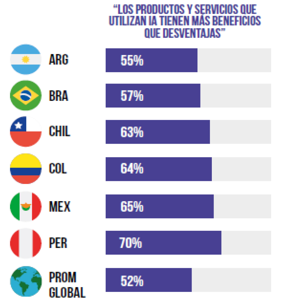 Una encuesta de IPSOS a personas de 28 países, entre los cuales participaron Perú, Argentina, Chile, Colombia, México y Brasil, las personas esperan que la IA mejore su situación en varias áreas como la Educación, Seguridad, Empleo, Shopping y Transporte, entre otros. Es decir, los latinos no están necesariamente en contra de este tipo de tecnologías y esto representa una gran oportunidad para los principales actores de la sociedad para generar una ruta hacia el uso responsable para que efectivamente les sirva a los ciudadanos, las empresas y gobierno.