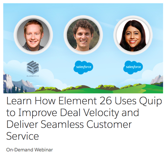 Not only does this help eliminate delays associated with siloed project management, but thanks to Quip’s flexible integration with the likes of Sales Cloud and Service Cloud, Element 26 can also scope, build and manage every opportunity, proposal, and project in the cloud.