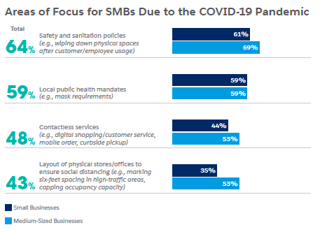 According to the SME Trends Report from Salesforce, SME leaders are emphasising on safety and sanitation policies. A total of 64% of leaders globally say that they’re focussing on these issues due to the COVID-19 pandemic, while 59% say that they’re prioritising local public health mandates.