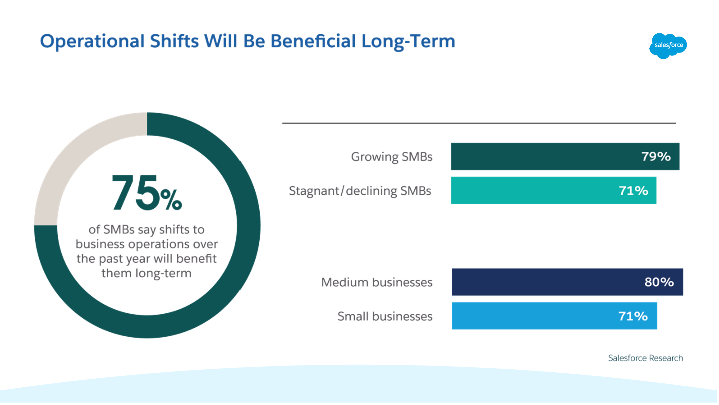 It was a lot to adjust to, but UK SMEs were up to the task. In fact, small business trends show that many of the stop-gap measures instituted by SMEs will have long-term payoffs. Let’s take a deep dive into the fifth edition of Salesforce’s Small and Medium Business Trends Report, which gathers insights from over 2,500 SME leaders, to see how setbacks are being turned into gains, and why the future looks to be a faster, smarter place.