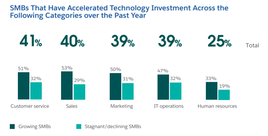 The SME Trends report shows that 71% of growing SMEs say they survived the pandemic because of digitisation. Additionally, 51% increased their technology investment in customer service and 53% increased it in sales.